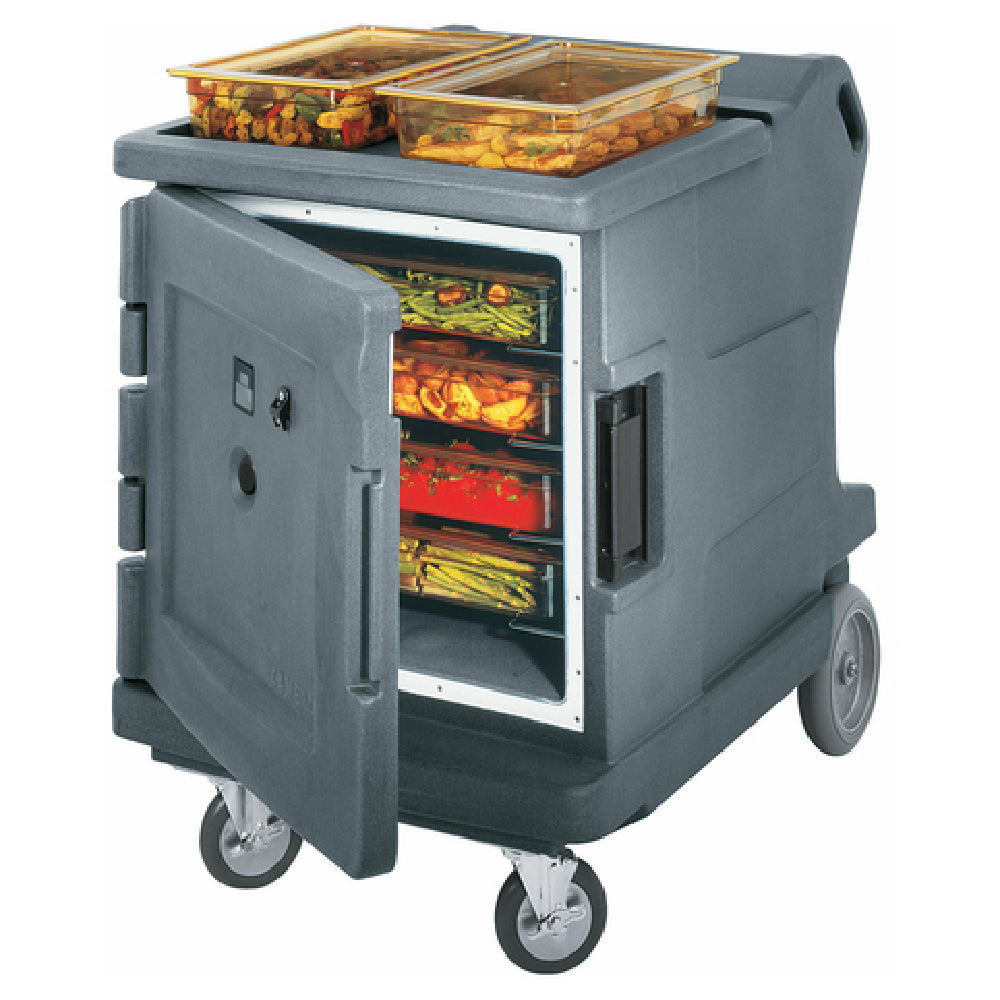 Cambro, CMBH1826LF191, Camtherm® Hot Cart, 30-1/2"W x 42"D x 42-3/8"H, electric, low profile, single door, holds (11) 18 X 26 sheet pans (requires five additional rail sets), (12) 12" x 20" x 2-1/2" deep food pans, (8) 12" x 20" x 4" deep food pans, (6) 12" x 20" x 6" deep food pans, or (4) 12" x 20" x 8" deep food pans, temperature control dial, on-off power switch, adjustable chrome plated steel slide rails, Fahrenheit solar digital thermometer, molded-in handles & bumpers, nylon door latches, serving top, with vent, menu clip, polyethylene exterior, (2) 6" front swivel casters with brakes & (2) 10" rigid rear casters, cord/plug, granite gray, 110v/50/60/1-ph, 1035 watts, 9.1 amps, NEMA 5-15P, NSF, ENERGY STAR®, cETLus