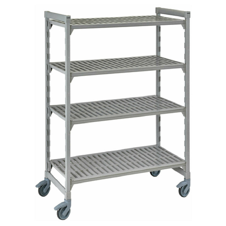 Cambro, CPMU244867V4480, Camshelving® Premium Mobile Starter Unit, 24"W x 48"L x 67-1/4"H, 4-tier, withstands temperature -36°F (-38°C) to 190°F (88°C), includes: (4) vented polypropylene shelf plates with Camguard® antimicrobial protection, (2) pre-assembled post kits (posts constructed of steel with polypropylene exterior), (8) traverses, molded-in dovetails, (2) sets of post connectors, (4) premium swivel casters with total locking brake, 900 lbs. max capacity, speckled gray, NSF