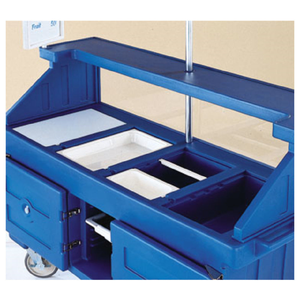 A commercial vending merchandising kiosk is a specialized outdoor or indoor equipment unit designed for displaying, selling, and serving food and beverages. The Cambro CVC724158 Camcruiser® Vending Cart functions as a portable food display station, featuring weather-resistant polyethylene construction, four full-size wells, and integrated storage compartments. Installed in settings such as outdoor markets, event venues, or quick-service setups, it facilitates efficient product merchandising and customer interaction in moderate-traffic foodservice environments.