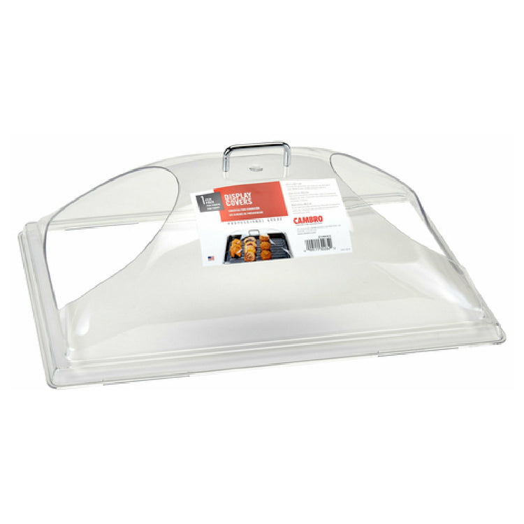Cambro, DD1220BECW135, Camwear® Display Dome Cover, 21-7/8"W x 14-3/4"D x 8"H, fits 12" x 20" tray, with (2) ends cut, chrome handles are attached, polycarbonate, clear