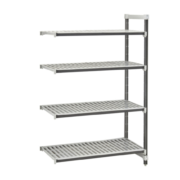 This Cambro EA213064V4580 shelving add-on offers a durable, antimicrobial, four-tier storage solution with vented polypropylene shelves. Its modular design integrates seamlessly into existing Camshelving® Elements setups, supporting high capacity of 800 lbs per shelf, suitable for moderate foodservice workloads. Constructed for long-term use, it features composite posts with leveling feet and corrosion-resistant plastic components. Its ease of assembly and maintenance simplifies cleaning routines, facilitating efficient workflow in busy commercial kitchens and storage areas.