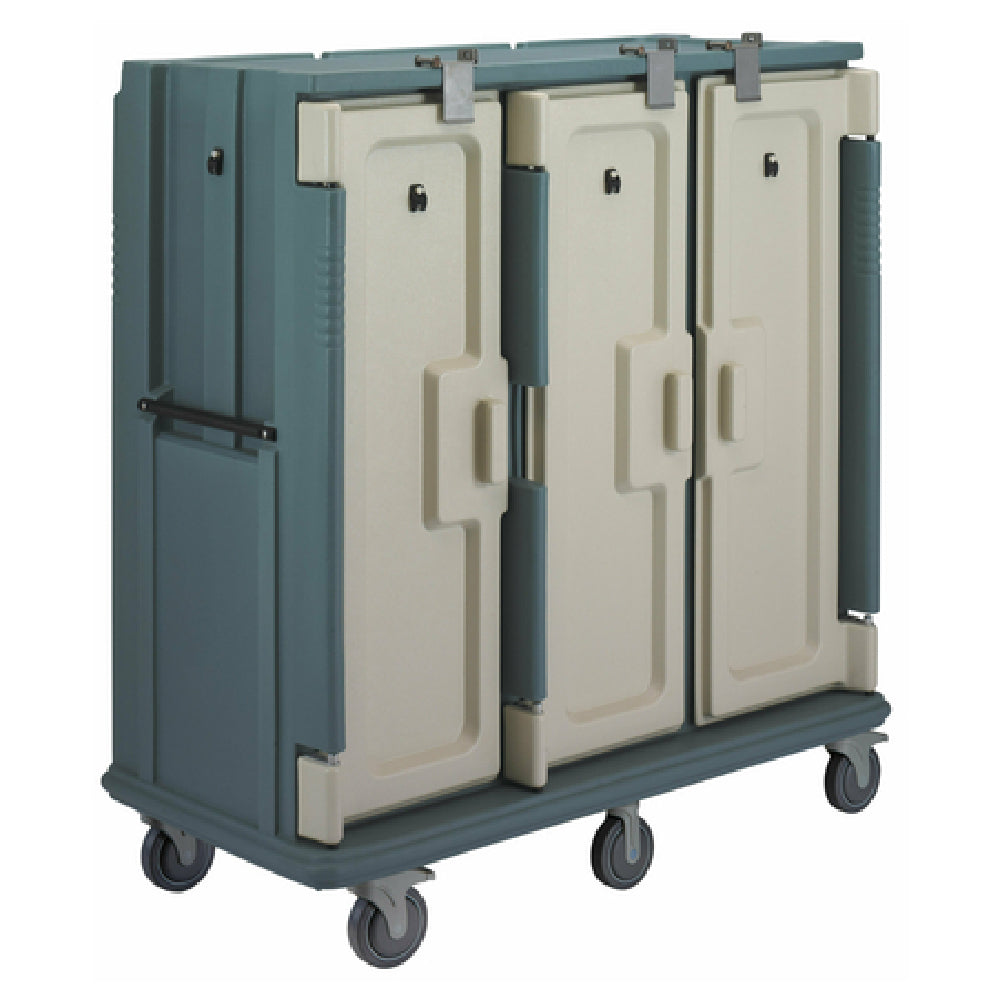 The MDC1418T30401 model features a self-contained, insulated plastic construction with precise dimensions of 60 inches width, 29-1/4 inches depth, and a height adjustable between 61 and 66 inches, optimized for ergonomic handling. It utilizes six 6-inch stainless steel casters—two fixed and four swivel with brakes—providing stable, noise-minimized movement. The cart's weight is approximately 258 lbs, ensuring durability without sacrificing maneuverability. Its insulation maintains meal temperature during transit, supporting food safety standards. The unit’s exterior is finished in slate blue with cream-colored hinged doors, combining functional design with an appealing aesthetic.