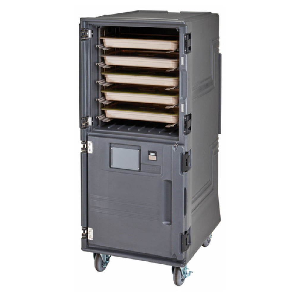 The Cambro PCUHH615 Pro Cart Ultra™ Hot Food Pan Carrier with front loading is a commercial-grade insulated food transport solution designed for high-volume foodservice operations. Built with durable polyethylene exterior in charcoal gray, this electric heated cabinet supports multiple sheet pan configurations, including (16) 18" x 26" full size, (32) 13" x 18" half-size, and GN 1/1 food pans (2-1/2" deep). Equipped with insulated solid Dutch doors, adjustable stainless steel rails, and a perimeter bumper, it ensures consistent food temperatures and secure loads during transport. Its 110V system delivers 529 watts of power, integrated with a solar digital thermometer for precise temperature management, making it ideal for catering, banquets, and bulk transportation of prepared foods.