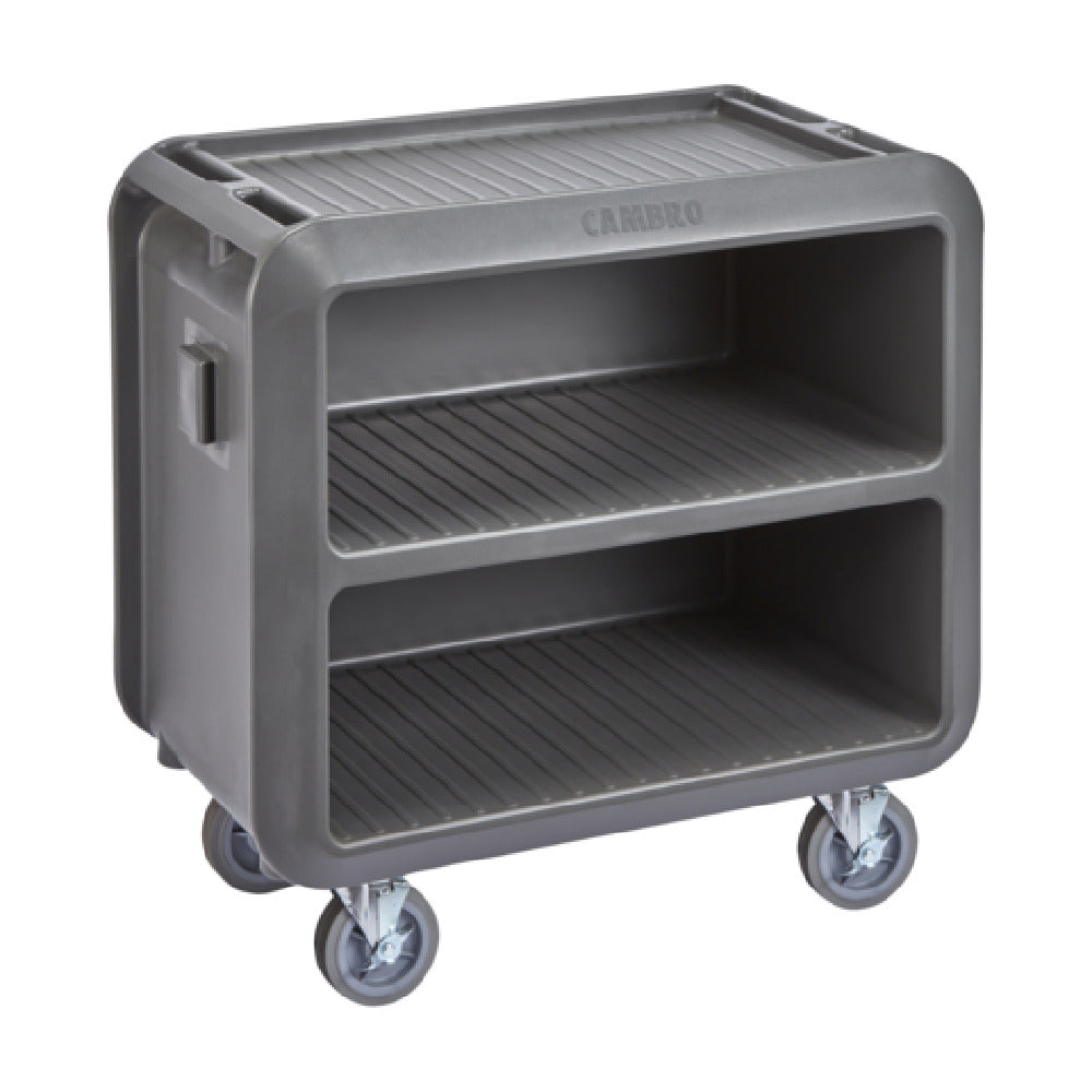 The Cambro SC330110 Service Cart Pro is a durable and versatile utility cart designed for demanding commercial foodservice environments. Measuring 37-1/2 inches in length, 22 inches wide, and 37-1/4 inches in height, this medium-sized polyethylene cart features three ribbed shelves with a total weight capacity of 600 lbs, supporting up to 200 lbs per shelf. Its one closed side enhances stability and containment, making it ideal for transport and storage tasks within bustling kitchens, catering facilities, and healthcare settings. Crafted from high-density polyethylene and built with a one-piece molded body, the Service Cart Pro offers robust resistance to impacts and chemical cleaning agents, ensuring long-term performance and sanitation. Its NSF compliance underscores its suitability for rigorous hygiene standards, while its mobility is supported by two rigid and two swivel casters, each with brakes for safety and ease of maneuvering in tight spaces.