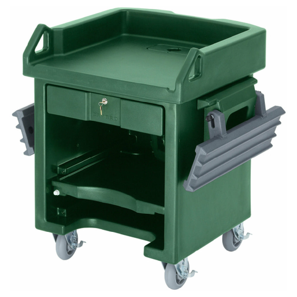 Cambro, VCSWRHD519, Versa Cash Register Cart, 52-3/4"L x 32"W x 43-3/4"H, lockable center drawer, adjustable shelf and rails, cut out design, will not dent, crack or rust, one-piece, seamless, double-wall polyethylene, polyurethane foam insulation, molded-in handles, non-electrical, (4) heavy duty 6" swivel casters with brakes, Kentucky green (made to order), NSF
