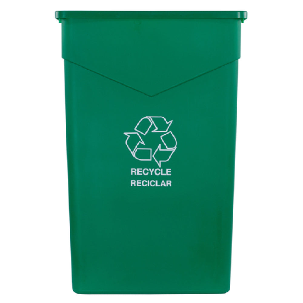 Compared to similar plastic waste containers, the Carlisle 342023REC09 features heavy-duty polyethylene construction, integrated corner tabs for enhanced stability, and bottom helper handles for easier transport and maintenance. Its open rectangular design maximizes space efficiency, supporting streamlined waste management in high-traffic foodservice environments. The imprint with the recycling symbol ensures clear differentiation and promotes eco-friendly disposal practices, improving operational sanitation and workflow efficiency without sacrificing durability or ease of handling.