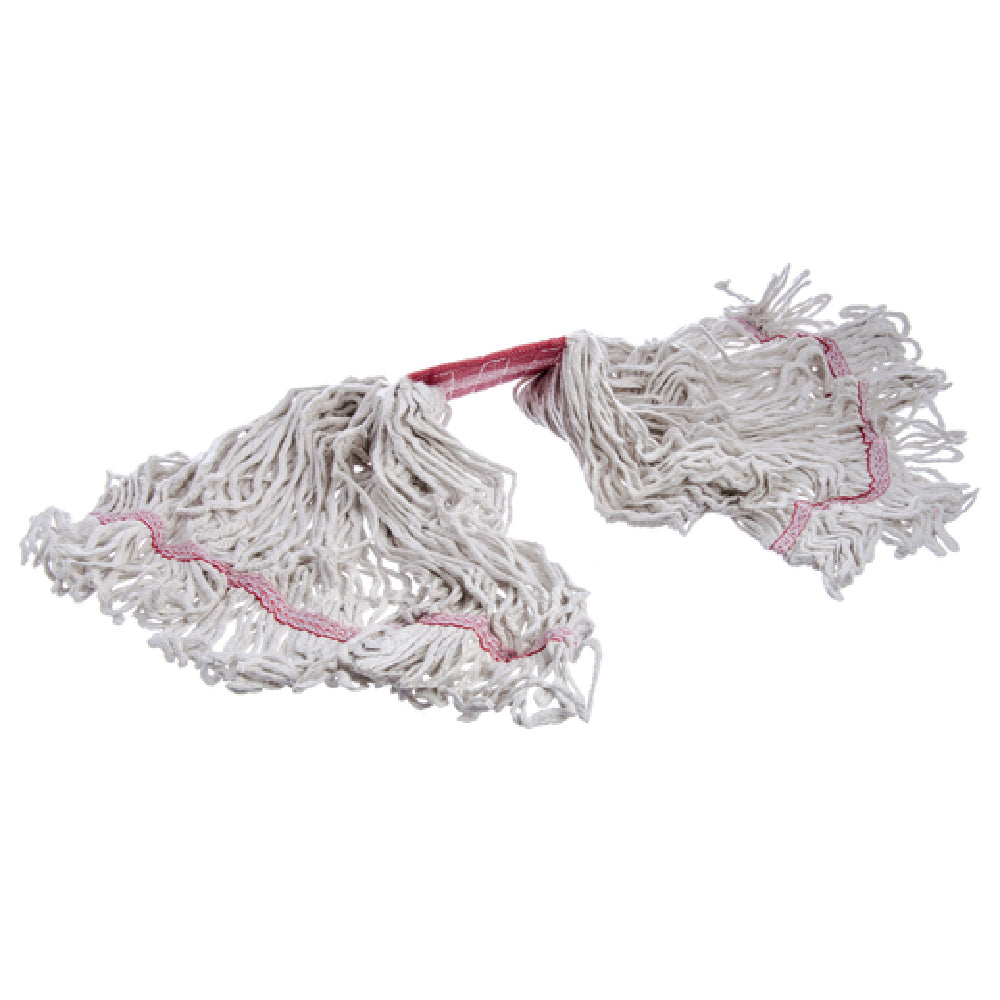 The Carlisle 369552B00 Carlisle Flo-Pac® Wet Mop Head Large 4 Ply is a professional-grade cleaning accessory designed for commercial foodservice operations. This all-purpose wet mop head features a large size, constructed from durable washable white cotton yarn with a 4-ply thickness, and looped-end style for enhanced longevity. Equipped with a red 5" wide vinyl coated band, it ensures secure attachment to mop handles. Its non-bacterial resistant composition and non-pre-shrunk fabric make it suitable for institutional cleaning environments, offering consistent quality and performance in high-use settings.