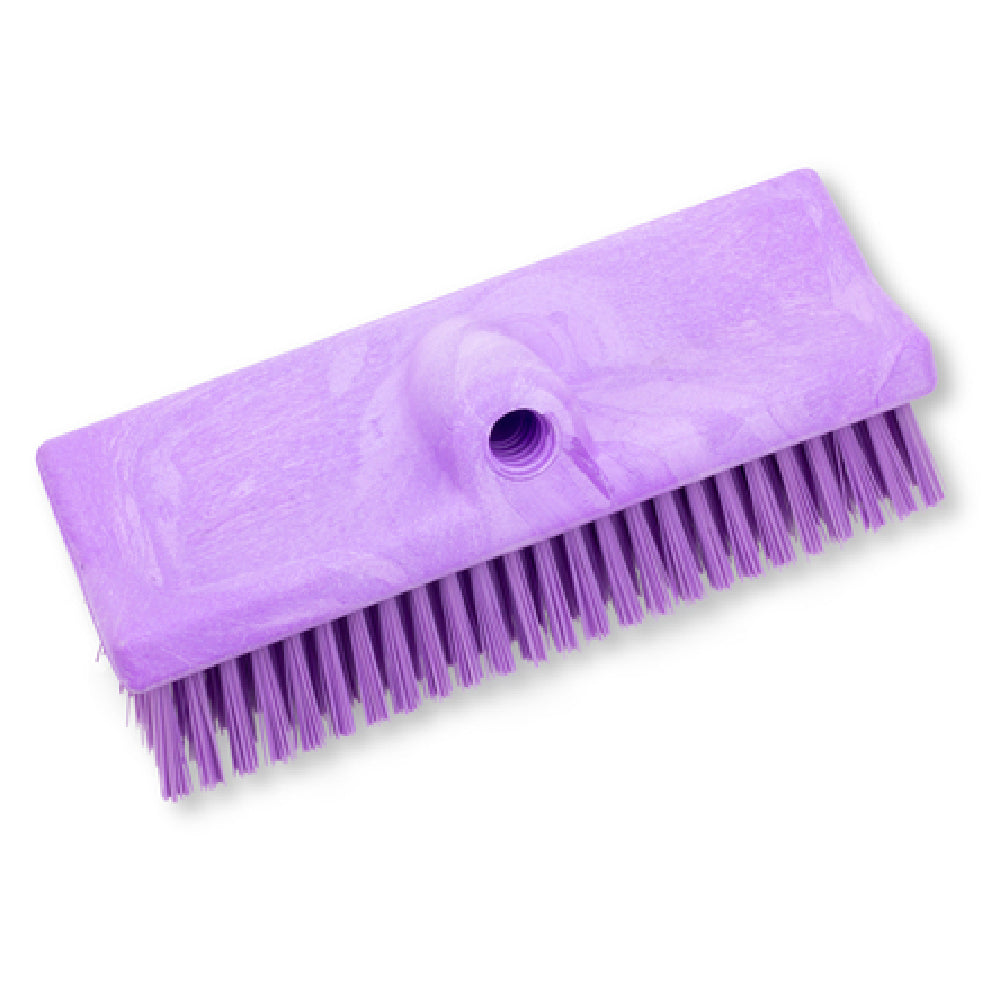 The Carlisle Sparta® dual surface floor scrub brush head features a 10-inch plastic block with a split-shaped profile and a threaded handle hole for compatibility with standard handles. The crimped polyester bristles provide resilient scrubbing power, resistant to deformation on hard surfaces. Weighing approximately 1.55 pounds, this BPA-free brush head is constructed from durable, safe plastic, suitable for repeated, rigorous use in commercial environments. It maintains performance within standard cleaning temperature ranges and is finished in purple for easy identification in high-volume settings. The product adheres to standard weight and size specifications for commercial cleaning tools, designed for compatibility with various floor cleaning workflows.