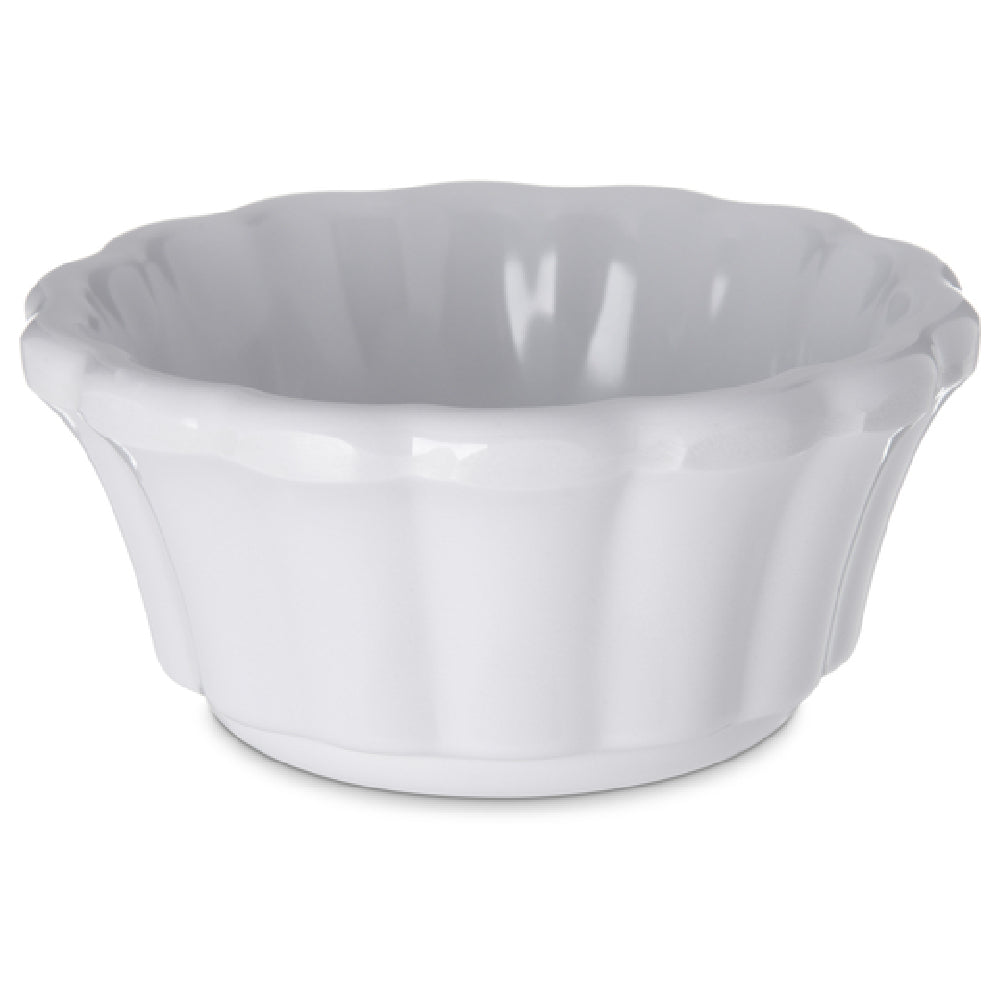 The Carlisle 4394402 Carlisle Ramekin 3 Oz. 3-1/3" Dia. is a commercially-designed plastic ramekin crafted from durable melamine material. With a capacity of 3 oz. and a diameter of 3-1/3 inches, it offers a scalloped exterior that enhances presentation and grip. Its high resistance to staining and breakage, combined with dishwasher compatibility, makes it suitable for high-volume foodservice environments. The ramekin withstands temperatures up to 212°F, ensuring safe use in heated applications without deformation or warping. This product facilitates efficient portion control in both casual and fine dining settings, particularly in kitchens requiring durable, stackable condiment or sauce cups capable of enduring rigorous handling and cleaning processes.