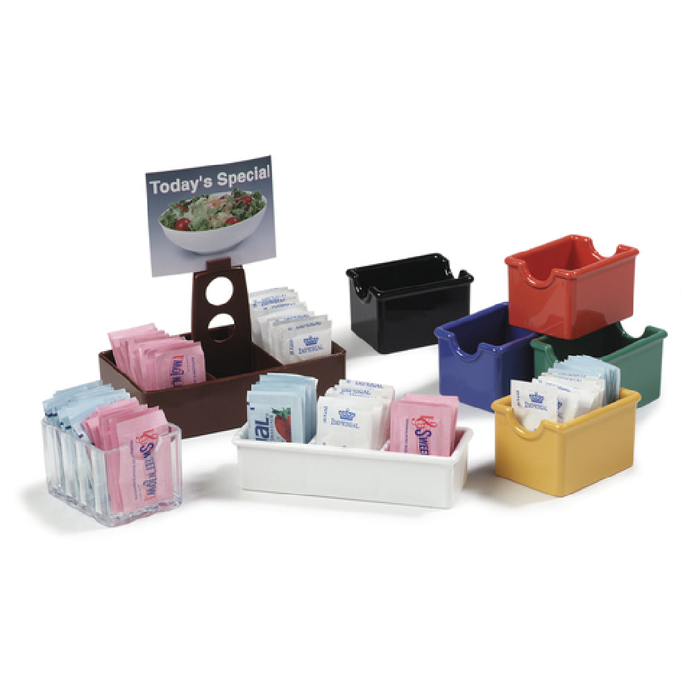 The Carlisle 455103 Carlisle Merchandiser Caddy Plastic 6-1/2"L X 4"W X 1-5/8"H is a commercial condiment caddy designed for foodservice environments requiring organized storage of sugar packets and condiments. Manufactured by CFS Brands, this plastic merchandiser features precise dimensions of 6-1/2 inches in length, 4 inches in width, and 1-5/8 inches in height, with the capacity to hold up to 50 sugar packets. It incorporates two dedicated pockets for salt and pepper shakers, along with a sign/message clip for clear communication. Its construction with durable, dishwasher-safe, stain, break, and chip-resistant styrene material makes it suitable for high-use applications in busy foodservice operations, hospitality settings, and catering services. The compact design ensures effective countertop organization, supporting workflow efficiency in tabletop condiment stations or self-serve areas.