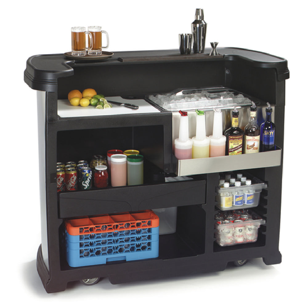 The Carlisle 755003 Carlisle Maximizer™ Portable Bar is a professional-grade mobile bar unit designed for commercial foodservice environments. Constructed from durable low-density polyethylene with a sleek black finish, this fully assembled unit measures 56 inches in length, 26-1/2 inches in width, and 48-1/2 inches in height. It features an integrated 15-gallon ice-bin with a dust cover, an integrated drain and water trap, and is equipped with a stainless steel Speed-Rak™, built-in cutting board, molded bar mat well, sliding storage drawer, side storage compartment with molded-in rails, and four lockable, non-marking swivel casters. Engineered for robustness and functional efficiency, this portable bar offers precise storage and beverage preparation capabilities suitable for high-volume venues, catering setups, or mobile bar services in foodservice settings demanding reliable, easy-to-clean equipment. Its technical specifications emphasize stability, capacity, and ease of maintenance, making it a versatile solution for professional bar operations.