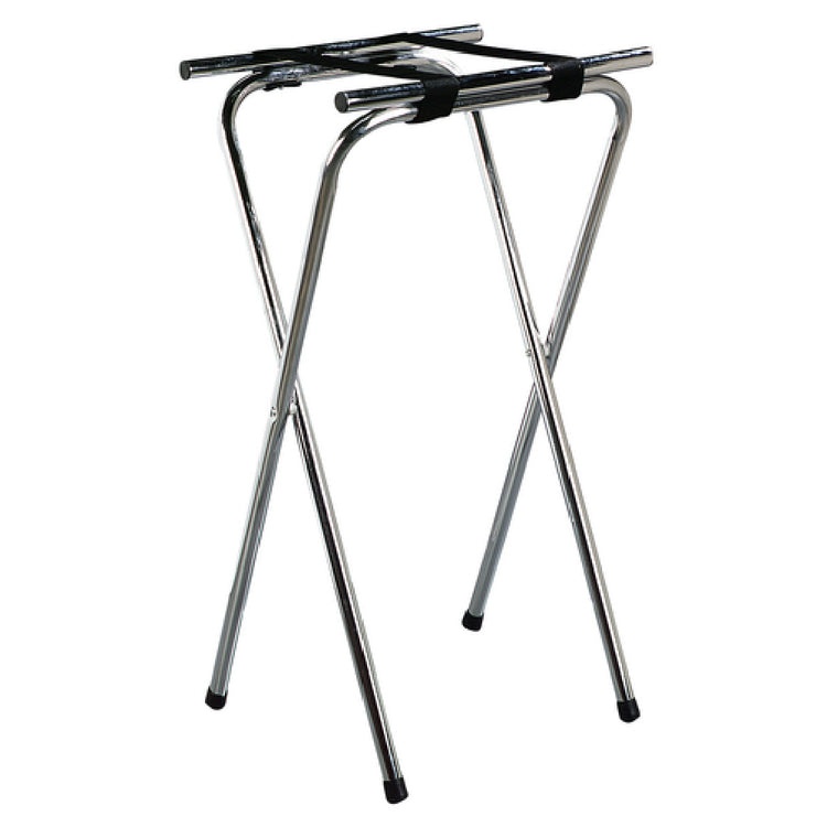 The Carlisle C3625T38 Carlisle Folding Tray Stand is a durable, professional-grade foodservice accessory designed for commercial kitchens requiring stable and adjustable tray support. Constructed with a chrome-plated steel tubular frame, this extra-tall stand measures 19 inches in length, 16 inches in width, and stands at 36 inches high, making it suitable for high-volume foodservice operations. Equipped with two black straps and cross-bar supports, it ensures secure tray placement. Its non-marking plastic feet provide stability without damaging flooring surfaces. Ideal for cafeterias, catering operations, and food prep areas, this stand enhances workflow efficiency with its robust design and straightforward folding mechanism for space-saving storage.