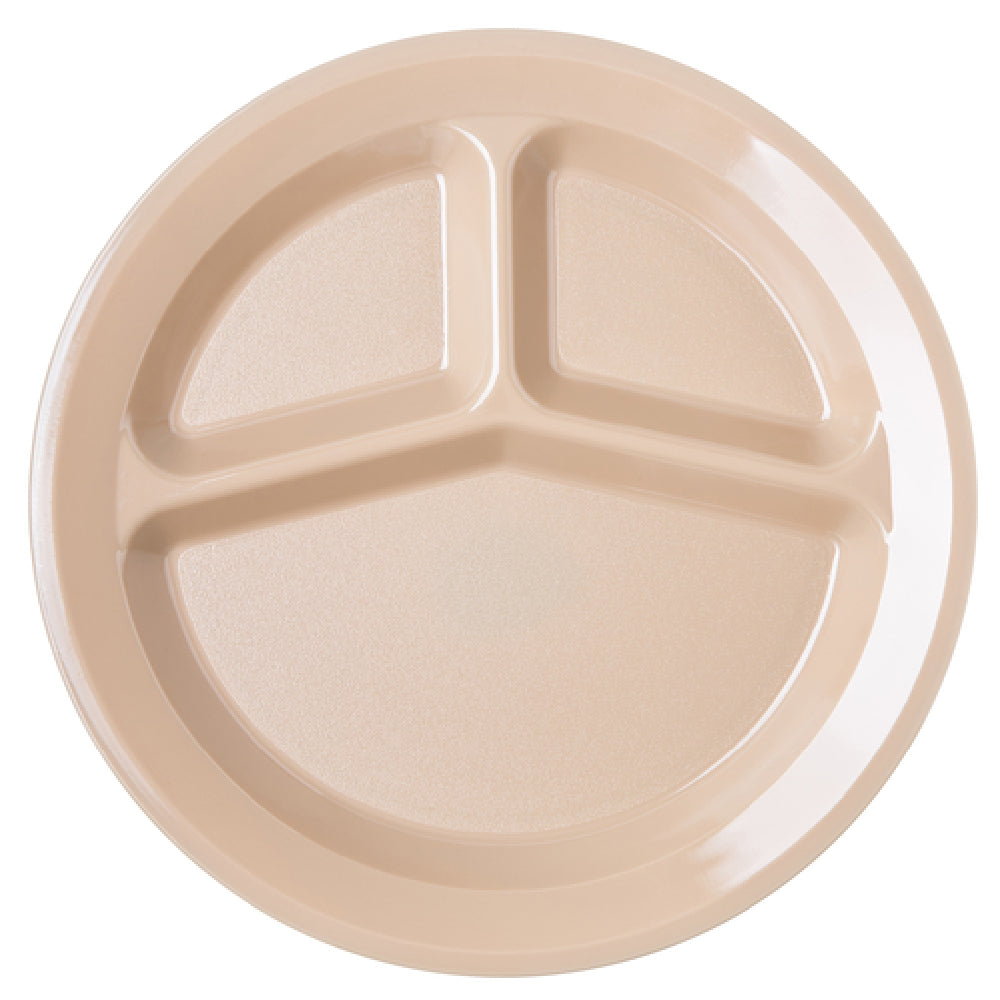 CFS Brands, PCD21125, Carlisle - Compartment Plate, (3) 1-1/4" deep wells, 11" dia., narrow rim, dishwasher safe, stain/break/chip/scratch resistant, safe for temperatures -40°F to 212°F, recyclable, stackable, polycarbonate, tan, NSF