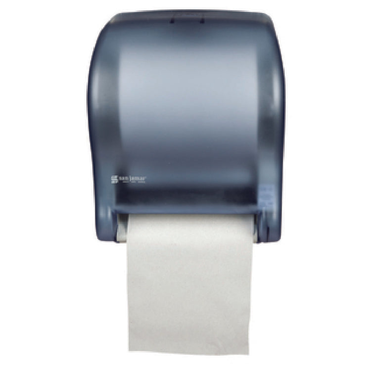 The Carlisle T8000TBL San Jamar Tear-n-Dry Essence™ Classic Towel Dispenser is a commercial-grade paper towel dispenser designed for high-traffic foodservice environments. Manufactured by CFS Brands, this touchless wall-mounted unit measures 11-3/4 inches wide, 9-1/8 inches deep, and 14-7/16 inches high, featuring impact-resistant translucent plastic in arctic blue. It accommodates an 8-inch wide roll with an 8-inch diameter, dispensing 10-inch towel lengths, and is powered by four D-cell batteries (not included). Its lockable front panel enhances sanitation and security, making it suitable for restaurants, cafeterias, and hospitality settings, optimizing workflow efficiency with hands-free operation and durable construction for long-term use.