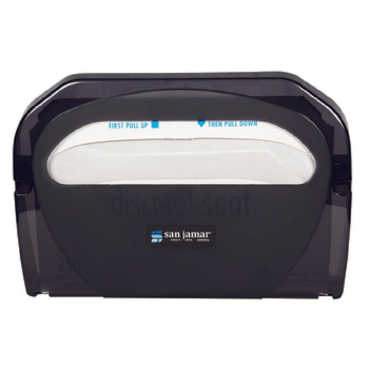 The Carlisle TS510TBK San Jamar Toilet Seat Cover Dispenser is a commercial-grade restroom accessory designed for hygienic and efficient toilet seat cover dispensing. Featuring a 17-1/4" width, 3-1/8" depth, and 11-3/4" height, this dispenser holds one package of standard toilet seat covers, providing a reliable, one-at-a-time dispensing mechanism. Its translucent black pearl finish enhances visibility of remaining supplies while maintaining a professional appearance, making it suitable for high-traffic public restrooms in hospitality, healthcare, and foodservice environments. Constructed from durable materials to withstand frequent use, this unit simplifies restroom maintenance and promotes hygiene compliance with its user-friendly design.