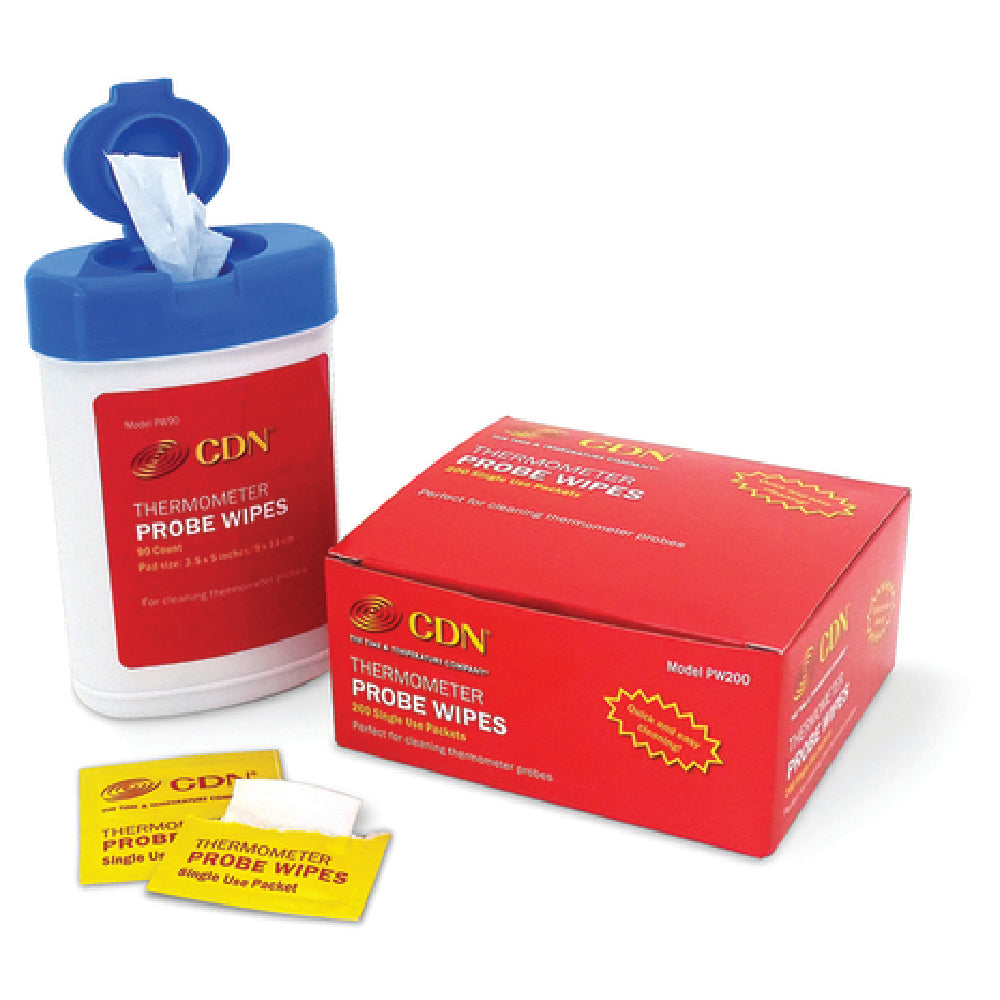 The CDN PW1000 Thermometer Probe Wipes are specialized cleaning wipes designed for precise sanitation of food temperature probes in professional foodservice environments. These single-use wipes are saturated with 70% isopropyl alcohol, ensuring effective microbial reduction on thermometer probes. Each pad measures 1-1/5" x 2-1/5" (3 x 5.5 cm) and comes individually wrapped in foil packets for hygiene and convenience. Packaged as a case containing 1000 wipes (200 packets per box, 5 boxes per case), these wipes are optimized for high-turnover commercial kitchens, food safety compliance, and equipment maintenance, making them essential for foodservice operations requiring regular probe sanitation without cross-contamination.