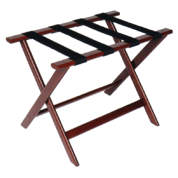 Central Specialties Ltd., 177CM, Deluxe Luggage Rack, 26"W x 17"D x 18-1/2"H, flat top, 2-1/4" polypropylene black straps, rivet-hinge joint, wood frame, cherry mahogany finish, (custom finishes & straps - special order) (per case = 5) (Packed By: Cs)