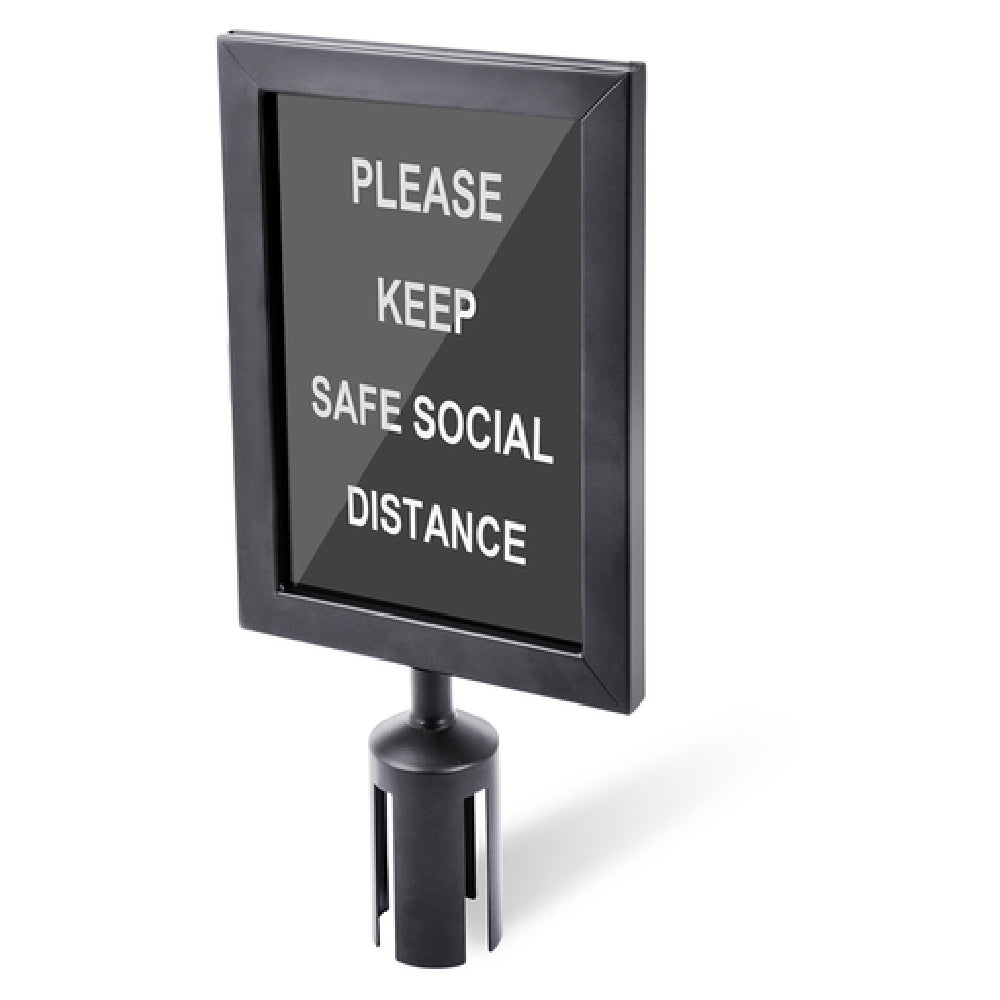 A commercial crowd control sign frame is a sturdy, free-standing display device designed to hold and present signage in high-traffic environments. The Central Specialties 5847BK model features a black finish and dimensions of 8-1/2" x 2-1/2" x 18" high, ideal for positioning alongside stanchions such as 5800BK. It is used predominantly in restaurant lobbies, theaters, and event spaces to provide clear directional guidance, safety notifications, or promotional messages, supporting efficient flow management and customer communication with minimal setup effort.