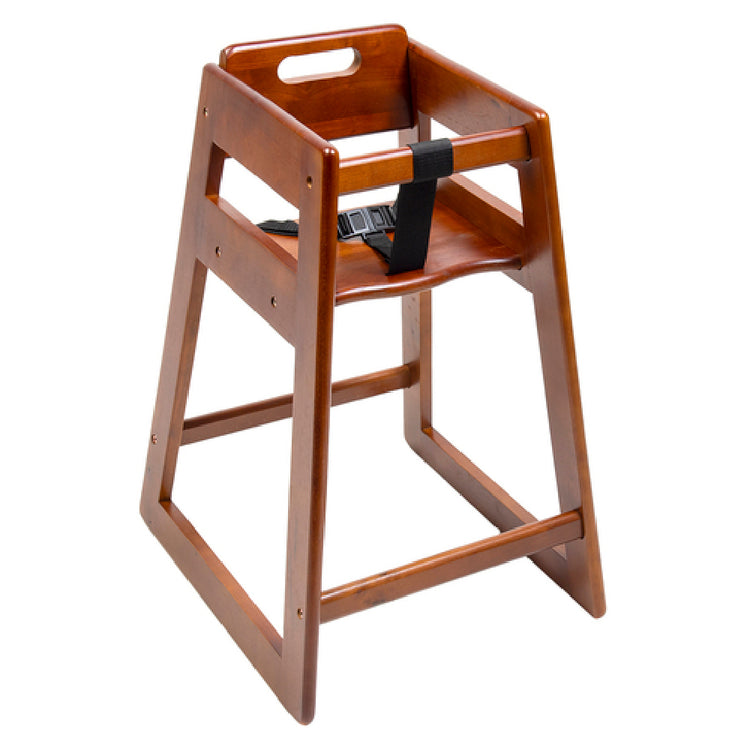 The 900DK model features a robust rubberwood frame finished in dark stain, measuring 16-3/4 inches wide, 19-3/4 inches deep, and 27 inches high, with a total weight of 14 lbs. It is a stackable "A-frame" configuration, supporting regular use in high-traffic foodservice environments. Designed to meet ASTM F404-18 standards, this high chair ships assembled for immediate deployment. Its construction emphasizes ease of cleaning, with no electrical components or refrigeration used. Dimensions and weight make handling and storage straightforward, facilitating quick setup and repositioning within commercial dining areas. The chair’s safety features include a secure seatbelt and crotch strap, with scalloped seating for ergonomic comfort.