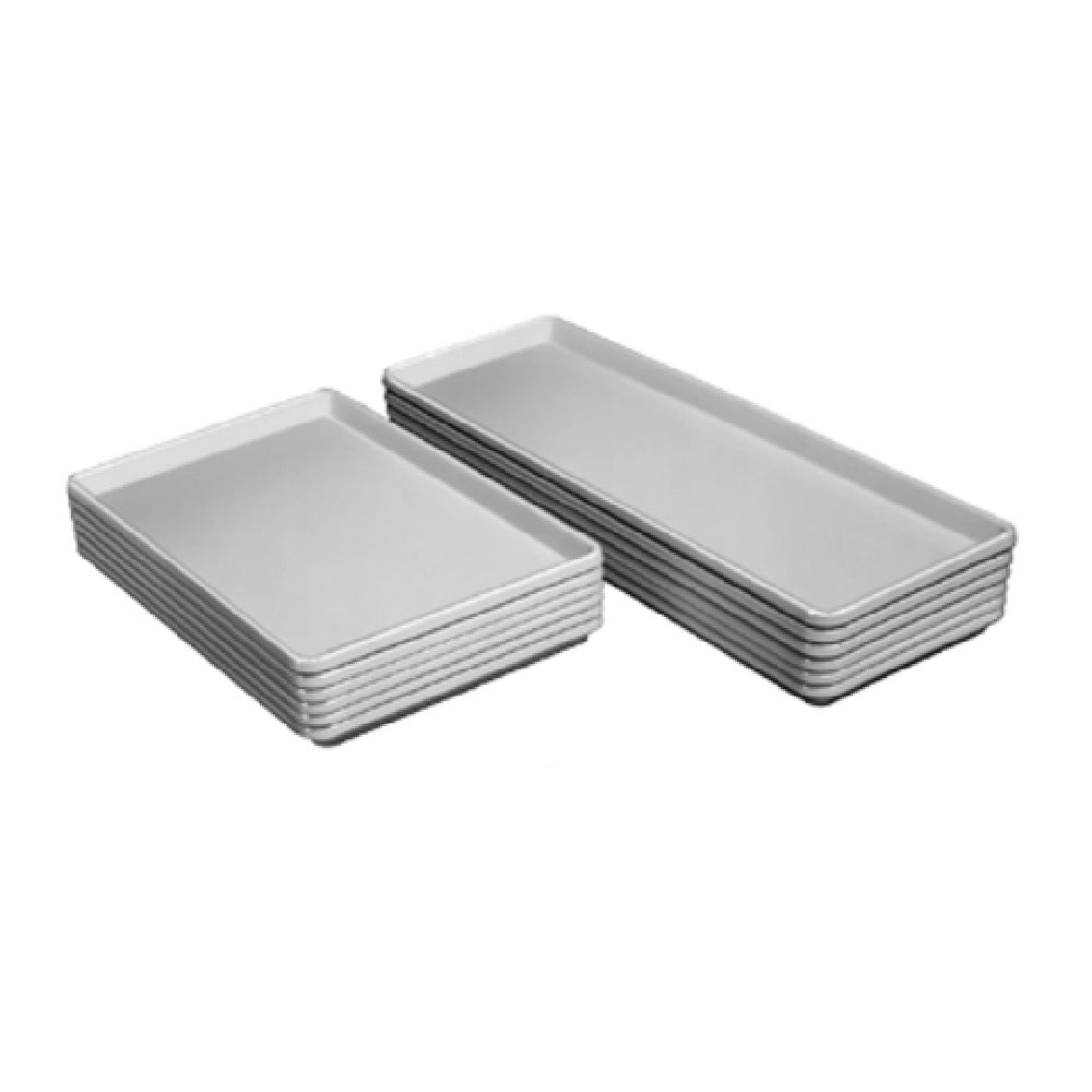 The Channel P1826-G high-impact styrene trays, platters, lugs, and pans are specialized display solutions designed for commercial foodservice environments such as marketplaces and bakery stations. These rectangular plastic platters measure 18 inches in width and 26 inches in depth, providing ample surface area for product presentation and storage. Constructed from durable high-impact styrene, they offer resistance to chipping and cracking, ensuring longevity in busy culinary settings. The reinforced edges enhance stability and handling, while the sanitary, safe-edged ‘finger-tip’ grip design facilitates secure, hygienic maneuvering. These trays are compatible with standard platter racks and feature an easy-to-clean surface for maintenance efficiency. Ideal for use in high-volume retail displays or bakery showcases, they support optimized product visibility and workflow integration in commercial kitchens and retail foodservice points-of-sale.
