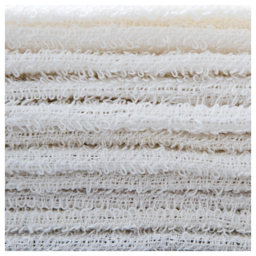 A commercial bar towel is a heavy-duty textile designed for high-frequency use in bars, restaurants, and catering establishments. Typically made from durable, absorbent materials such as 100% cotton, these towels support quick drying and cleaning tasks in fast-paced foodservice environments. The Chef Approved 167700BRT18 Bar Towel, in particular, is a 19" x 16" white towel with an 18oz weight per dozen, optimized for wiping glasses, bar surfaces, and kitchen equipment. Installed in bar stations and prep areas, it provides reliable performance for moderate workloads like daily bartender operations and food prep, maintaining hygiene and operational efficiency in busy settings.