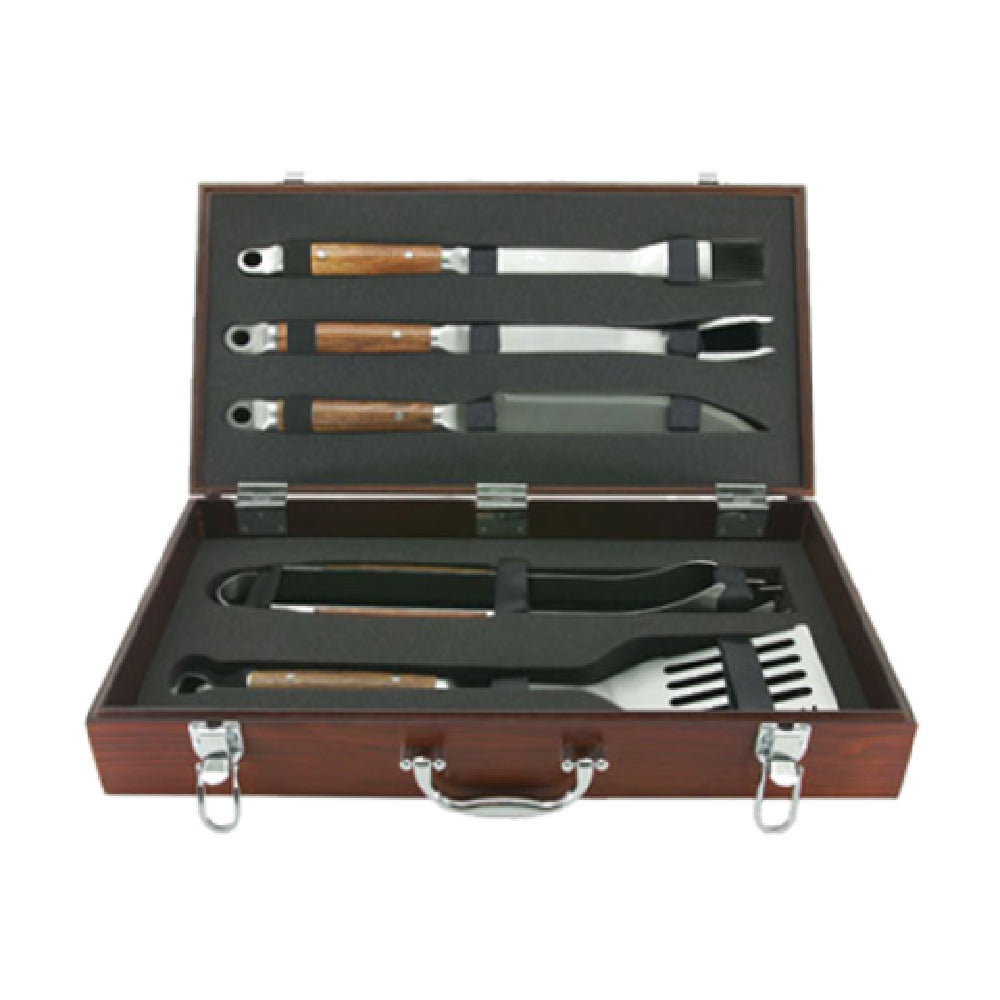The Chef Master 02136X tool set features forged stainless steel construction with a total weight of 24.3 lbs, engineered for durability and long-term use. It includes a spatula, fork, tongs, basting brush, and knife equipped with rosewood handles, all housed in a wood storage case. The utensils support intensive cleaning routines and can withstand high operating temperatures typical of commercial grilling environments. Its design aligns with ergonomic standards for comfort during prolonged use, and the materials meet safety and sanitation standards required in professional foodservice applications. The set is non-electrical, requiring no power supply, and is ready for straightforward maintenance.