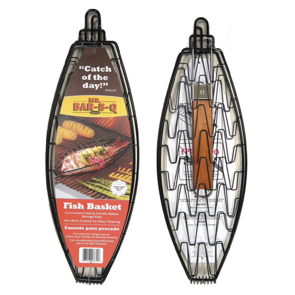 The Chef Master 06630Y Mr. Bar-B-Q® Fish Basket is a professional-grade outdoor barbecue accessory designed for commercial foodservice environments requiring precise and durable fish grilling solutions. Measuring 24-4/5 inches in length by 5-4/5 inches in width, this flexible grill basket features an expandable, folding handle for unobstructed access and secure handling. Crafted from high-quality, non-stick materials, it facilitates efficient food release and simplifies cleaning. Its technical construction ensures compatibility with various outdoor grilling setups, making it suitable for restaurant-quality seafood preparation and high-volume catering operations. Its precise dimensions and material properties optimize heat transfer and durability during repeated use in demanding kitchen workflows.