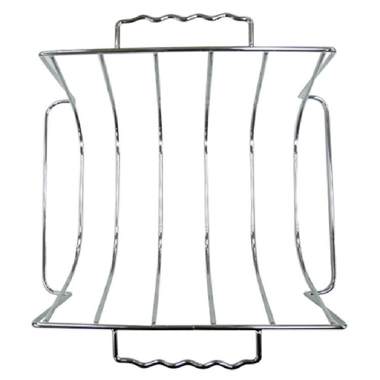 This rib & roasting rack offers robust chrome plating for corrosion resistance and easy cleaning, supporting high-heat environments typical in commercial barbecue settings. Its precise dimensions accommodate large cuts of meat, facilitating efficient workflow for professional cooks. Designed for durability, it withstands frequent handling and cleaning, ensuring consistent performance in busy kitchens. The ergonomic design simplifies placement and removal from grills, reducing downtime during service. Its technical build ensures stable support and even heat exposure, critical for achieving premium cooking results and product presentation during large-scale foodservice operations.