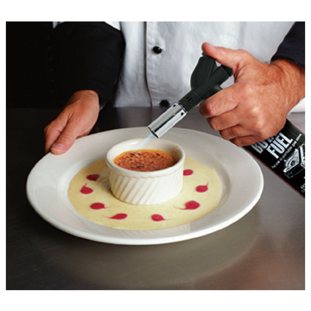 The Chef Master 90014 Chef-Master™ Professional Chef's Torch is a high-performance butane torch designed for professional culinary applications. This commercial-grade torch features an anti-flare device and push button automatic ignition to ensure safe and reliable operation. With an adjustable flame control reaching up to 2,192°F (1,200°C), it provides precise heat delivery suitable for pastry finishing, caramelization, and other specialized kitchen tasks. Capable of burning for up to 3 hours per 8 oz. canister of Chef Master # 40062 Butane Fuel (sold separately), it delivers 4,873 BTU, making it an essential tool for foodservice establishments requiring consistent, intense heat output and durable construction.