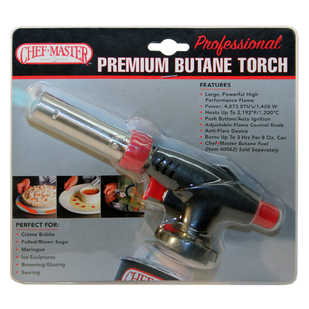The Chef Master 90022 Chef-Master™ Premium Butane Torch Large Anti-flare Device is a professional-grade culinary torch designed for high-precision applications in commercial kitchens. Crafted by Chef Master, this large, self-contained butane torch features an anti-flare design, push button automatic ignition, and an adjustable flame control knob capable of reaching temperatures up to 2,192°F/1,200°C. Engineered for durability, it operates efficiently with up to 3 hours of continuous burn time per 8 oz. canister of Chef Master # 40062 Butane Fuel (sold separately), delivering an output of 4,873 BTU. Ideal for applications ranging from pastry finishing to caramelization, this device integrates seamlessly into food presentation workflows, providing consistent, restaurant-ready results.