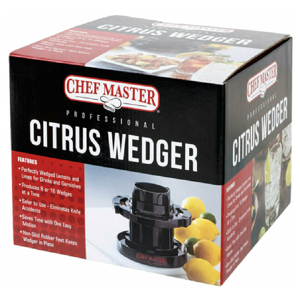 The Chef Master 90023 Citrus Wedger is a robust food preparation device featuring a model number 90023 and weighing 2.57 lbs. Its construction uses high-grade, food-safe plastics with a black finish that resists wear. This unit typically ships within 1 to 2 days, making it suitable for quick deployment. It incorporates non-skid rubber feet for stability in high-use environments. The wedger is designed to process 8 to 10 wedges per cycle, supporting moderate throughput in foodservice operations. Its dimensions support easy countertop integration, with straightforward disassembly for cleaning and sanitation.