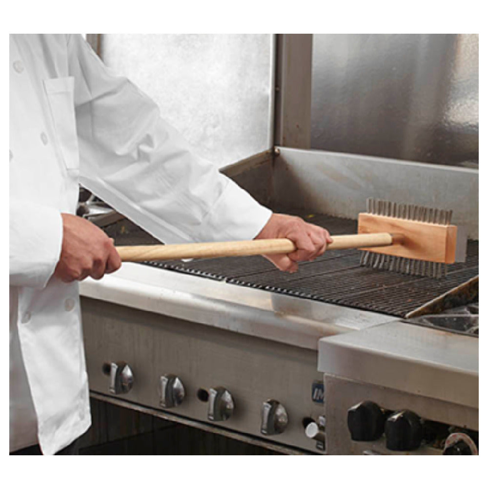 Designed for commercial broiler cleaning, the Chef Master 90042 broiler brush features a durable stainless steel bristle head, a long 30-inch handle for extended reach, and a scraper for stubborn residue removal. Its double crimped collar enhances bristle retention, ensuring longevity in high-volume kitchens. The wooden handle provides a secure, ergonomic grip for operators, reducing fatigue and increasing efficiency during frequent use. Suitable for installing in busy foodservice environments, this brush supports workflow optimization by enabling thorough cleaning of grates and surfaces with minimal effort. Ideal for restaurant kitchens, cafeteria facilities, and catering operations requiring reliable, professional-grade tools for grill maintenance.