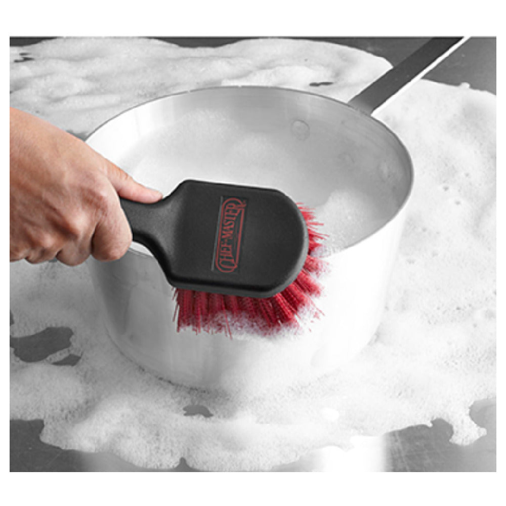 The Chef Master 90048 Pot Brush features an impact-resistant plastic handle measuring 8 inches in length and a width of 8 inches, providing an ergonomic grip for extended use. It is constructed with high-quality nylon bristles chosen for their resilience against aggressive scrubbing and ease of cleaning. This model, weighing approximately 8 pounds, is suitable for continuous operation in dishwasher environments or manual sanitation routines within commercial kitchens. Its design supports optimal workflow with a focus on durability and ease of maintenance. Compatibility includes standard foodservice ware, with temperature resistance suited for routine cleaning cycles. The product does not specify integrated electrical parts or cooling/refrigeration components, focusing solely on manual cleaning functions. It is available in black and red, with a strong emphasis on corrosion resistance and ease of sanitization, conforming to industry sanitation standards.