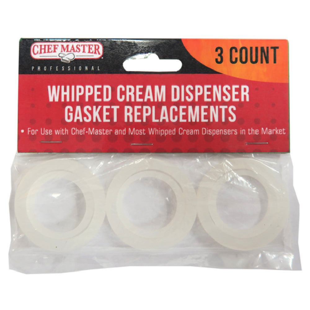 The Chef Master 90224 replacement gaskets are constructed from food-safe silicone with precise dimensions tailored to fit standard whipped cream dispensers. Each gasket weighs approximately 0.25 lbs, providing a lightweight yet durable component suitable for frequent disassembly and cleaning. They are compatible with equipment designed for standard fittings in high-volume commercial outlets. The gaskets withstand typical operating temperatures and cleaning routines without losing sealing integrity, ensuring consistent performance across varied foodservice workflows. These gaskets are non-porous, chemical-resistant, and designed to maintain hygiene standards, making them a critical component for maintaining dispenser efficiency. The pack size of three ensures multiple replacements for ongoing maintenance in high-traffic establishments.