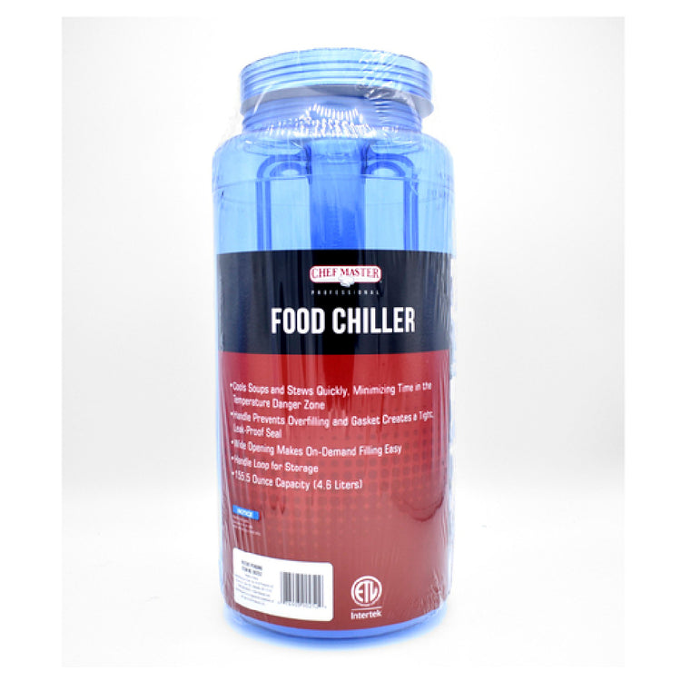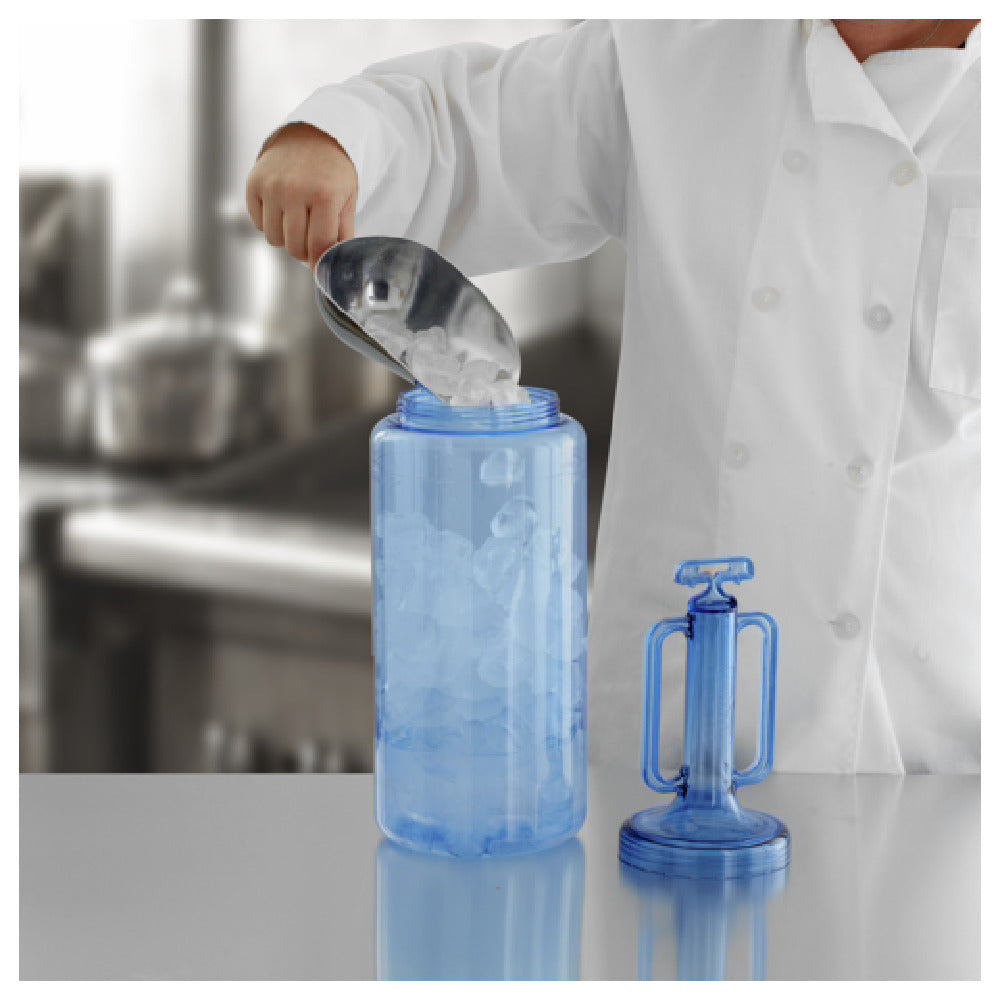 Designed for commercial kitchens, the Chef Master 90252 Food Chiller features a large 156 oz. capacity, leak-proof seal, and wide opening for efficient filling and cleaning. Its durable PETG construction ensures long-lasting performance under frequent use, suitable for food preparation stations and beverage setups. The handle provides easy transport and handling in busy culinary workflows, while the internal design supports rapid cooling processes. Compatible with ice cubes and water filling methods, this chiller streamlines ice management and ingredient chilling for mid to high-volume foodservice settings.