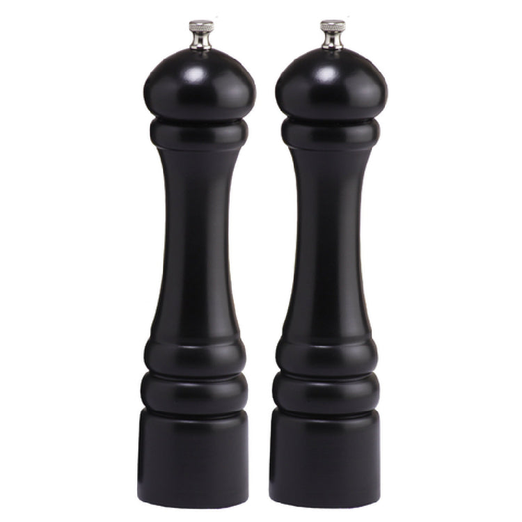 The Chef Specialties 10502 (105029) Chef Professional Series Imperial Salt Mill/Pepper Mill Set is a commercial-grade kitchen tool designed for precise seasoning in foodservice environments. Standing 10 inches tall with a sleek ebony finish, this set features a stainless steel pepper grinder complemented by a ceramic salt grinding mechanism. Made in the USA, it is engineered for durability and consistent performance, ideal for professional kitchens seeking reliable spice dispensing. Its technical construction emphasizes high-quality materials and a precision grinding system suitable for high-volume seasoning applications.