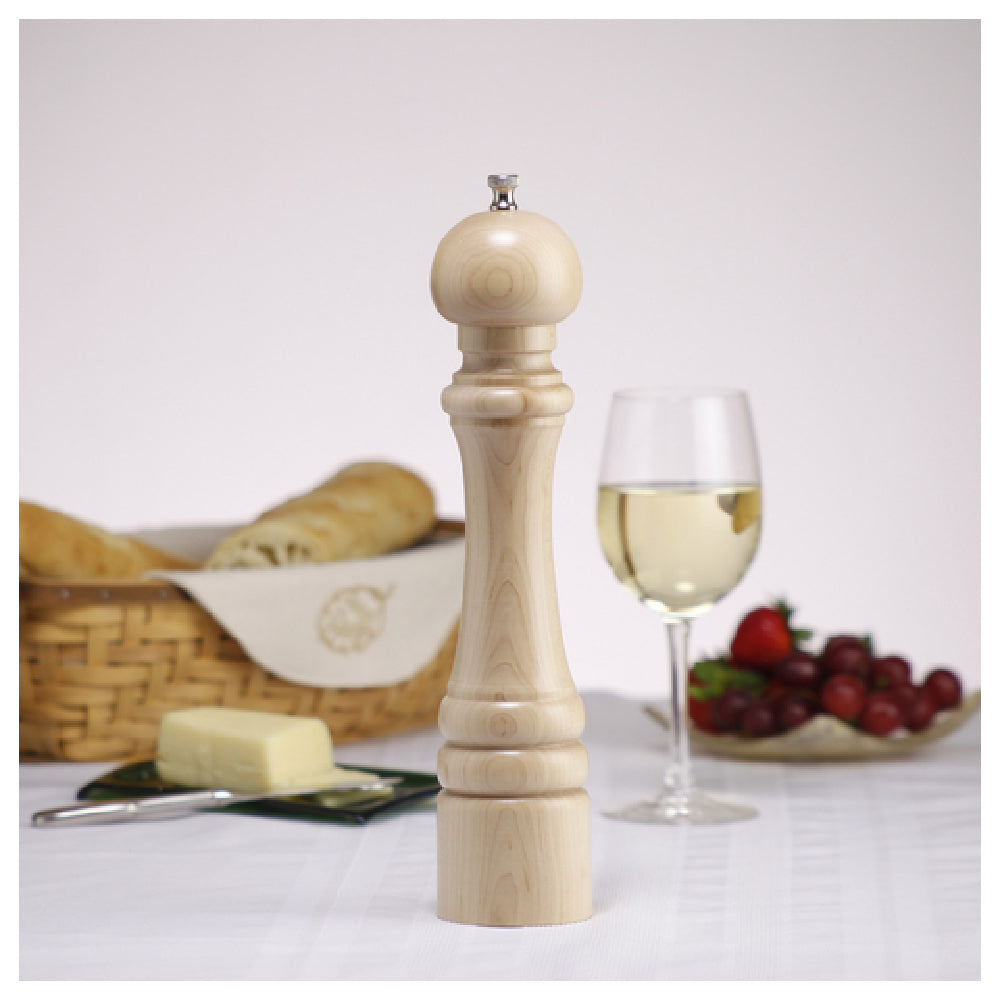 Made for commercial foodservice, the Chef Professional Series President Pepper Mill offers precise control with a stainless steel grinding mechanism, designed for durability and consistent performance in high-volume kitchens. Its 12-inch height ensures comfortable handling during busy service periods, while the natural wood finish complements various kitchen aesthetics. The durable construction supports frequent refilling and cleaning, making it a reliable choice for establishments requiring a premium spice grinding solution.