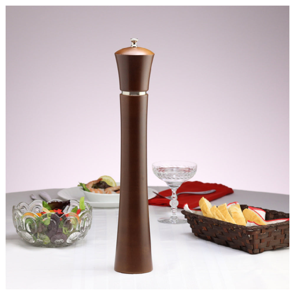 The Chef Specialties 17882 (178825) Chef Professional Series Pueblo Cafe Salt Mill is a commercial-grade spice grinder designed for precise seasoning in institutional kitchen environments. Standing at 17 inches, this salt mill combines durable wood with a mocha finish and stainless steel accents, delivering both aesthetic appeal and longevity. Equipped with a high-quality ceramic grinding mechanism, it offers consistent particle size, corrosion resistance, and ease of maintenance, making it a dependable component in high-volume foodservice applications. Made in the USA, it guarantees long-term performance with a lifetime warranty, suitable for contemporary cafes, hotel buffets, and restaurant establishments requiring customizable salt dispensing solutions.
