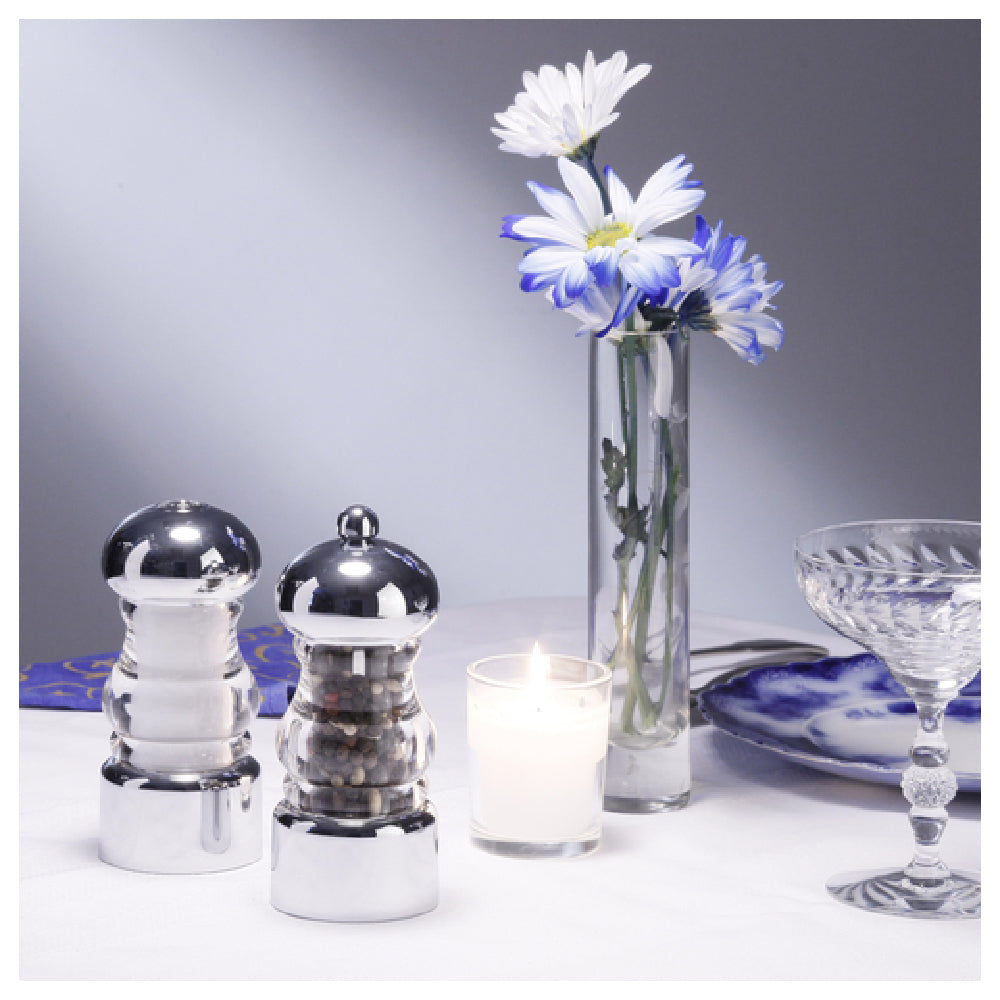 This Chef Specialties set features a 5.5-inch height with a stainless steel grinding mechanism housed within a clear acrylic and chrome exterior, ensuring long-lasting durability under constant use. Weighing 1.4 lbs, it is constructed for easy handling and frequent cleaning. The set is designed for tabletop application, with a focus on precise seasoning delivery. Its stainless steel grinding component guarantees consistent output, and the acrylic body provides clear visibility of spice levels. Easy to disassemble for cleaning, it comes pre-filled and is compatible with standard seasoning supplies in commercial kitchens. The unit’s construction and finish permit safe cleaning with typical kitchen cleaning protocols, supporting sanitation and operational efficiency.