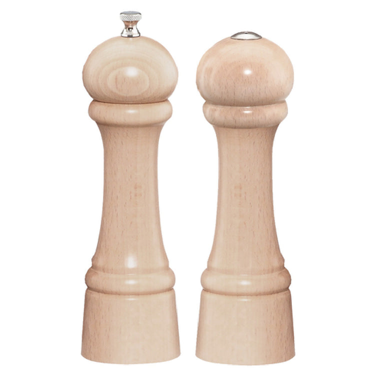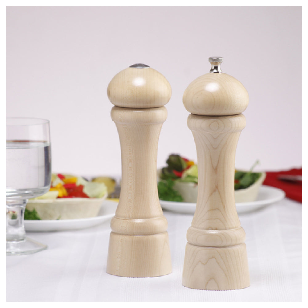 The Chef Specialties 8200 (082009) Chef Professional Series Windsor Salt Shaker and Pepper Mill Set is a commercial-grade culinary tool designed for precise seasoning in professional kitchens. Standing 8 inches tall with a natural wood finish, it features a durable stainless steel grinding mechanism engineered for consistent performance. Made in the USA, this set offers a lifetime warranty, making it a reliable choice for restaurants, catering operations, and upscale foodservice applications. Its technical construction ensures corrosion resistance and ease of refilling, supporting high workflow efficiency for seasoning automation and consistency.