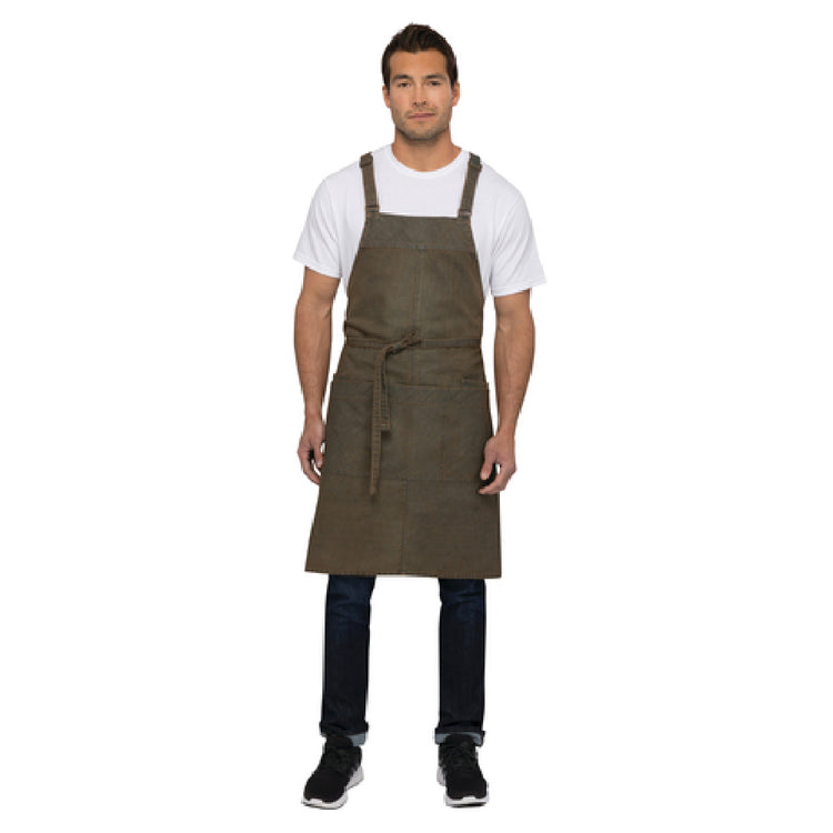 A commercial bib apron is a durable, protective garment designed for professional kitchen, restaurant, or hospitality use. It covers the front of the body, providing protection against spills, stains, and heat, while offering practical features such as multiple pockets for utensils and tools. The Chef Works ABX01-BTP-0 Uptown Bib Apron exemplifies this, featuring textured cotton/poly fabric, adjustable cross back ties, and ample pocket storage, making it ideal for medium-volume foodservice settings that demand resilience, ease of maintenance, and organizational functionality.