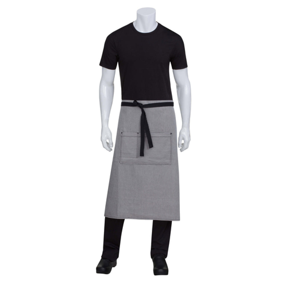 The Chef Works AW051-BLK-0 Portland Bistro Apron is a commercial-grade waist apron designed for professional foodservice environments. Crafted from a durable 83/17 cotton/polyester denim blend, this apron measures 30 inches in length and 31-1/2 inches in width, offering ample coverage and strength for high-volume kitchen tasks. Its feature set includes contrast tape ties for secure fastening, crisscross bar tacks for added durability, and a large front pocket with a dedicated cell phone divide—optimizing workflow and organization in busy kitchen settings. Ideal for restaurants, catering, and hospitality operations, this apron balances rugged material performance with functional design and professional appearance, making it suitable for demanding culinary workflows requiring resilience and practicality.