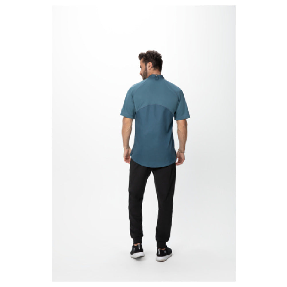 The Chef Works CBZ03-TEA-3XL Varkala Chef Coat features a lightweight construction with a total weight of 0.85 lbs, crafted from a 62/38 poly/cotton blend reinforced with 100% recycled polyester knit mesh for breathability. Its dimensions include a width of 37", depth of 31", and height of 1", designed for a 3XL fit. The garment's construction supports frequent laundering, with a maximum operating temperature suitable for standard commercial dishwashing cycles. It does not specify electrical or refrigeration requirements, as it is apparel. The coat is finished in a professional teal color, aligning with contemporary kitchen uniform standards. It offers ease of maintenance with fabric that maintains integrity after repeated cleaning cycles, ensuring hygiene and visual appeal. The product is designed for comfortable, durable wear in a variety of foodservice settings, from casual dining to high-volume catering.