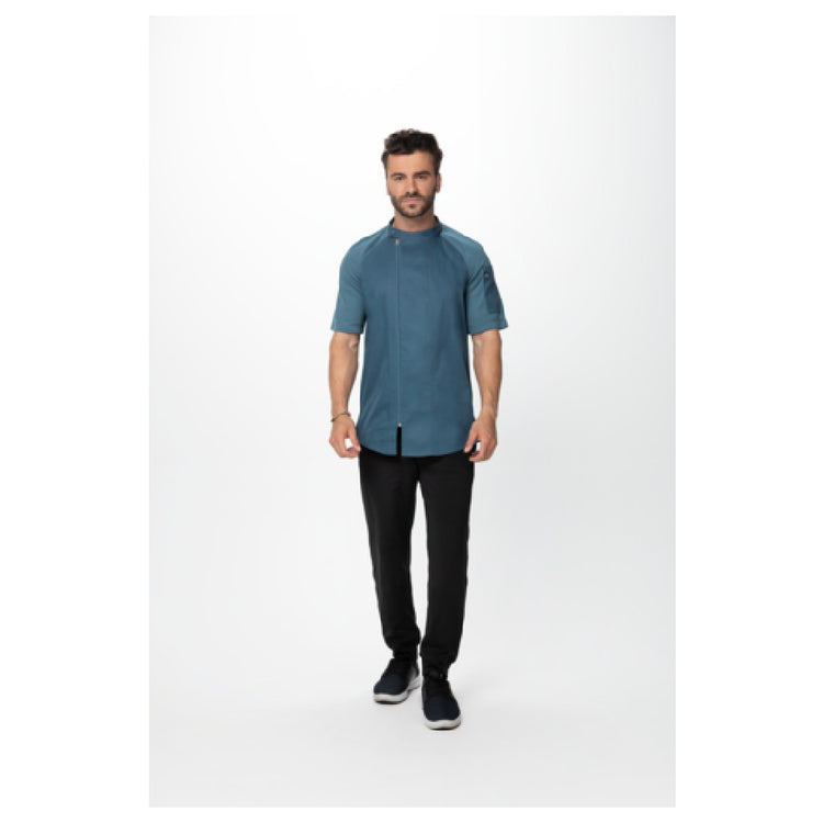 The Chef Works CBZ03-TEA-3XL Varkala Chef Coat is a professional-grade culinary garment designed for high-performance foodservice environments. Crafted by Chef Works, a recognized leader in restaurant apparel, this chef's coat features a raglan short sleeve design with an off-set zip front and snap collar, seamlessly combining durability with ergonomic comfort. Constructed from a 62/38 poly/cotton blend with 100% recycled polyester knit mesh, it offers superior breathability and ease of maintenance. The coat's technical features include side slits for enhanced mobility, a dedicated left sleeve pocket for tools, and front concealed thermometer and pen pockets, optimizing workflow efficiency in busy kitchens. Its precise technical construction supports hygienic standards and operational reliability, making it a choice for commercial kitchens requiring resilient, functional chef apparel.
