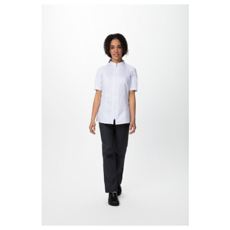 The Chef Works CBZ04W-WHT-XS Women's Arcadia Chef Coat is a professional-quality culinary uniform designed for female kitchen staff in commercial foodservice environments. This chef’s coat features a raglan short sleeve design with a center zipper closure, constructed from a durable 62/38 poly/cotton blend with 100% recycled polyester knit mesh side slits for enhanced breathability. It includes a left sleeve thermometer pocket and a back collar apron tab, optimizing functionality for high-demand kitchen workflows. The coat’s precise technical construction promotes sanitation, comfort, and ease of maintenance, making it suitable for busy restaurant, catering, and hotel kitchens seeking operational efficiency and professional appearance.