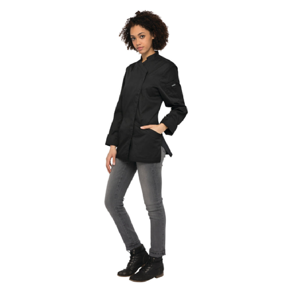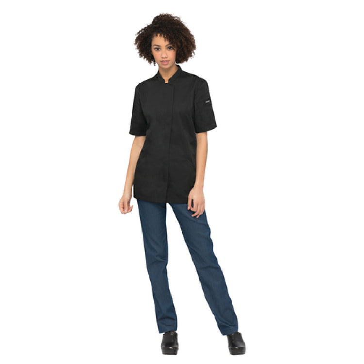 Chef Works, CES02W-BLK-XL, Women's Roxby V-Series Chef Coat, single-breasted, short sleeves, concealed snap closure, stretch sides and back panels, side seam slits, back collar apron holder with engraved snap, left sleeve thermometer pocket, right sleeve pocket, curved front hip pockets, slim fit, 65/35 poly/cotton twill, black, XL