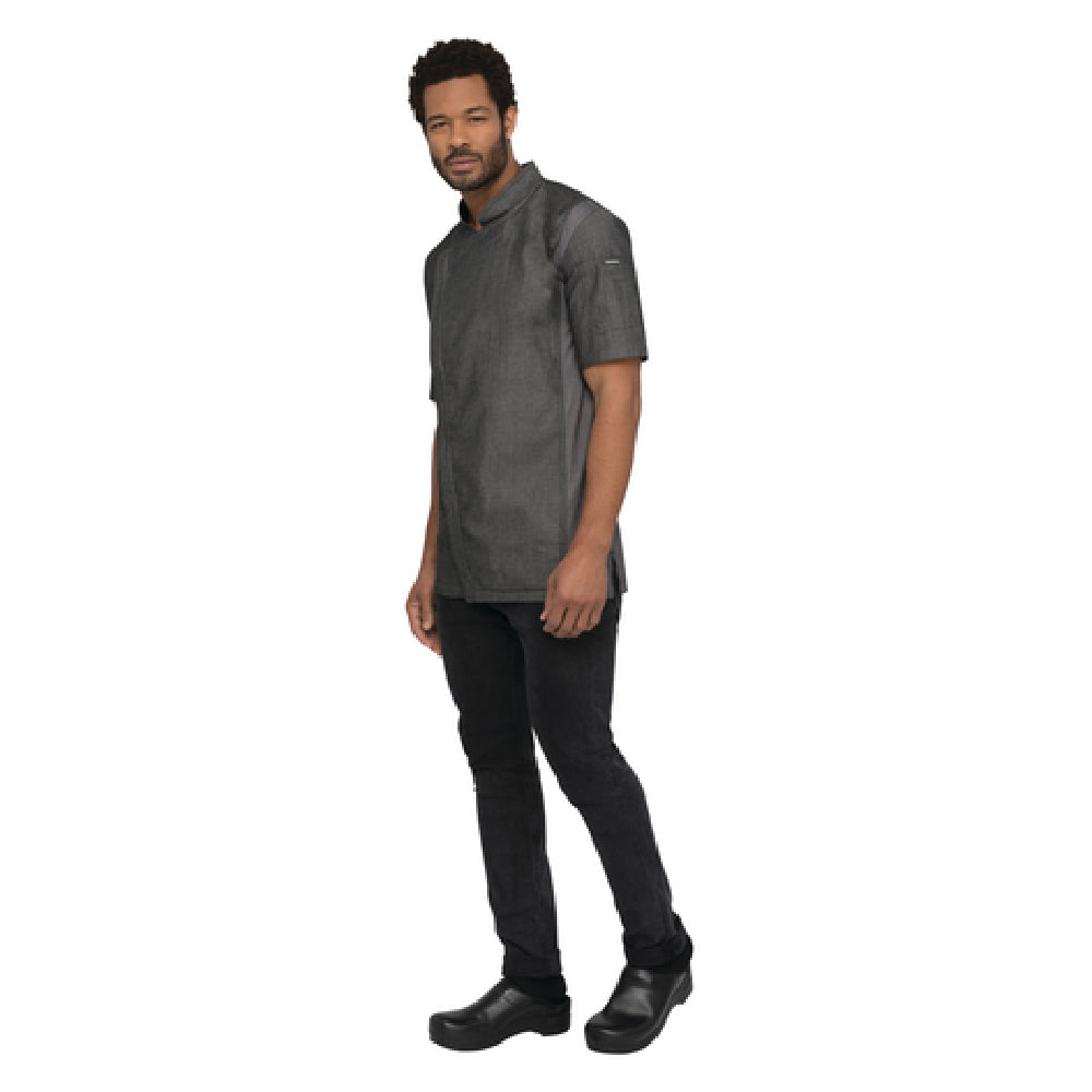 The Chef Works CEZ01BLKXL Delancey Chef Coat is a professional-grade chef's coat designed for commercial kitchens requiring durability, ergonomic fit, and functional features. Crafted from 100% cotton denim in black, this single-breasted short-sleeve chef's coat offers a modern fit optimized for high-volume foodservice environments. Its technical build includes a 2-way separating zipper, stretch side panels for enhanced mobility, and side seam slits for airflow and ease of movement. The coat features a back collar apron holder with engraved snap, a left sleeve thermometer pocket, and a right sleeve rounded cell phone pocket, making it suitable for culinary professionals in restaurants, catering, and hospitality settings requiring reliable and easy-to-maintain chef apparel.