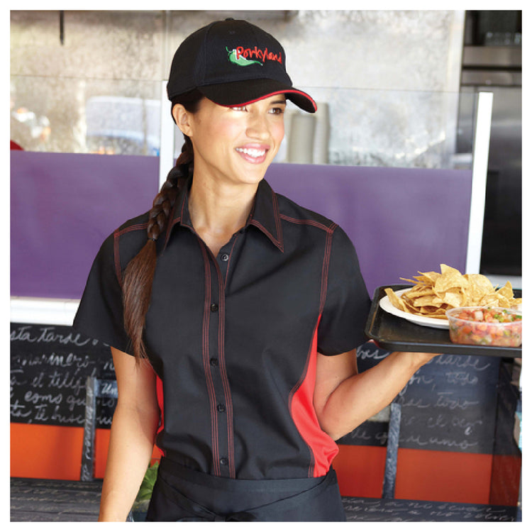 Chef Works, CSWC-BRM-M, Women's Universal Shirt, short sleeves, Cool Vent™ panels down both sides, triple contrast topstitching, matching buttons, form fit, 65/35 poly/cotton, black/red, medium