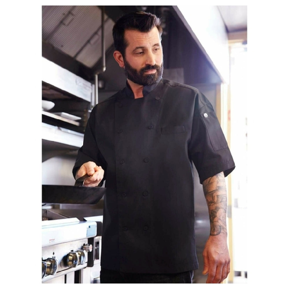 The Chef Works EWCV-BLK-S Palermo Executive Chef Coat is a professional-grade chef’s coat designed for high-performance culinary environments. Crafted from a durable 65/35 poly/cotton blend, this unisex short-sleeve chef's coat features a double-breasted front combined with cloth-covered buttons for a polished appearance. With an imposing black color, it facilitates stain concealment and aesthetic consistency in busy kitchens. Its prominent Cool Vent™ box pleat on the back enhances airflow, promoting comfort during extended shifts. Fit is generous to accommodate a variety of body sizes, and specific design elements such as a drop shoulder and inset pockets for thermometers make it functional for demanding foodservice operations. This model, with model number EWCV-BLK-S, is optimized for professional kitchens requiring durable, easy-to-maintain chef apparel with technical features supporting workflow efficiency.