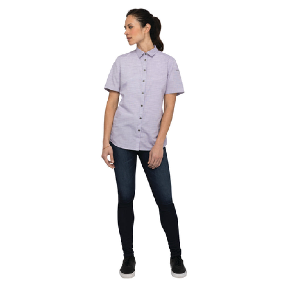 The Chef Works SHC01W-PUR-M Women's Havana Shirt is crafted with a poly/cotton material standard for durability and ease of cleaning, available in a vibrant purple finish. Its design includes a snap front closure, side hem detailing, and front darts for a fitted profile. Weighing 20.5 lbs, this shirt is suitable for frequent laundering without compromising integrity. The style is classified as a cook/kitchen type, with a short sleeve configuration tailored for high-performance foodservice environments. Dimensions and construction are optimized for comfort and practicality in fast-paced commercial kitchens, featuring an easy-to-maintain fabric that resists stains and wear. The shirt does not specify electrical requirements or cooling systems as it is apparel equipment.